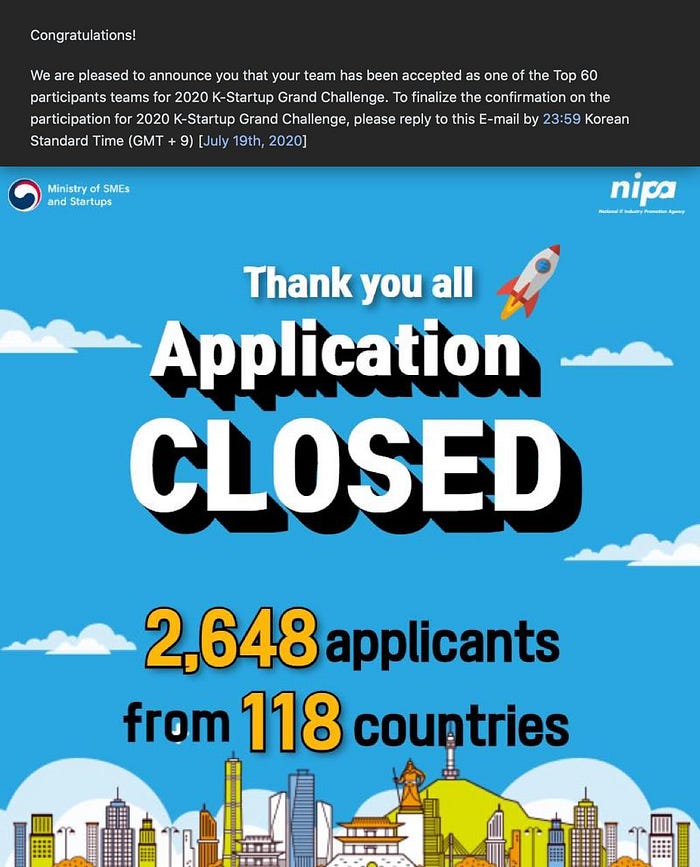 Hosted by the Ministry of SMEs and Startups (MSS) and organised by National IT Industry Promotion Agency (NIPA), K-Startup Grand Challenge is a highly selective accelerator program that invites only 60 out of 2,000+ technology-based global startups to South Korea and engages with the local businesses to kickstart their development in Asia. The program has been providing financial, technical, networking, visa support and so on to the selected technology startups since it was launched in 2016.